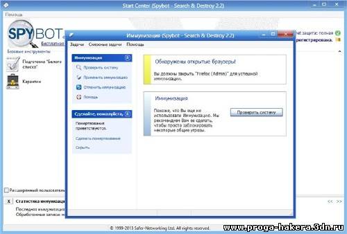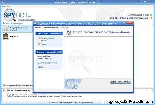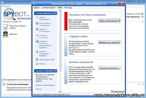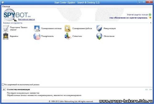 Spybot - Search & Destroy - утилита для поиска и удаления программ-шпионов (spyware), рекламных вставок (adware), программ-похитителей данных (hijackers) и иного вредоносного софта. Spybot - Search & Destroy сканирует жёсткий диск и реестр операционной системы, находя там шпионские модули и вредоносные ключи. База данных приложения постоянно обновляется разработчиками подобно обновлению антивирусных программ.