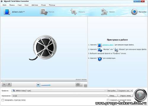 Bigasoft Total Video Converter - мощная программа, которая конвертирует любые видеофайлы в разные форматы. Поддерживает чтение и проигрывание большинства видео и аудиоформатов. Поддерживаются видео стандарты DVD/SVCD/VCD, имеется встроенный плеер для просмотра и прослушивания.