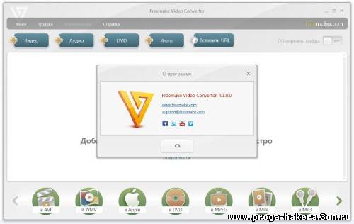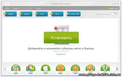 Freemake Video Converter – бесплатная программа для быстрого конвертирования видеофайлов в распространенные форматы, их редактирования и записи на оптические носители. Предусмотрены возможности подготавливать файлы для просмотра на мобильных устройствах, создавать слайд-шоу и извлекать звук из видеофайлов.
