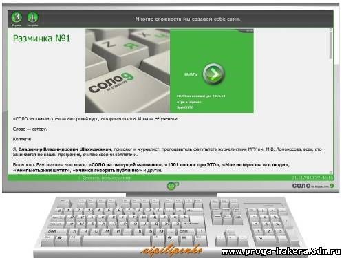 "СОЛО на клавиатуре" — это обучающая программа, позволяющая в короткий срок научиться быстро печатать на клавиатуре компьютера. Автор курса машинописи — известный психолог и журналист, преподаватель факультета журналистики МГУ Владимир Владимирович Шахиджанян. Нескольким сотням тысяч пользователей компьютера хорошо известна программа "СОЛО на клавиатуре", по которой многие научились набирать слепым десятипальцевым методом.