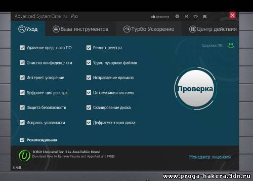 Поддерживает наивысшую производительность компьютера. Полностью оптимизирует Windows, обеспечивая исключительную производительность системы и высокую скорость Интернет за счет высвобождения собственной мощности системы, в зависимости от характера вашей работы с ПК и конфигурации сети. Программа превращает ваш компьютер в бизнес-машину, производительную рабочую станцию, центр развлечений, игровую машину и научный вычислительный центр. • Надежно защищает компьютер. Сканирует и анализирует особенности информационной безопасности в Windows. Обнаруживает и удаляет шпионские программы и рекламные модули, используя самые свежие базы, для предотвращения установки злоумышленниками вредоносных приложений на ваш компьютер. Стирает и обновляет историю использования вашего компьютера. • Один щелчок мыши устраняет 10 самых частых проблем на компьютере. Advanced SystemCare Pro совмещает легкость использования, унаследованную от предыдущих версий, с еще более мощными функциями. Одним щелчком мыши запускается сканирование и устранение десяти основных проблем с ПК и защита его от скрытых угроз безопасности. • Оптимизация в реальном времени. Функция ActiveBoost. Технология ActiveBoost непрерывно работает в фоновом режиме и обнаруживает неиспользуемые ресурсы. Грамотно перераспределяя ресурсы системы, технология обеспечивает максимальную эффективность использования процессора и памяти. • Свыше 20 уникальных инструментов для обслуживания ПК. Advanced SystemCare Pro включает последнюю версию Toolbox компании IObit's, с более чем 20 уникальными инструментами, как для ежедневного обслуживания компьютера, так и для продвинутых нужд. Набор Toolbox содержит инструменты для очистки, оптимизации и ремонта системы, инструменты для улучшения безопасности системы и инструменты для полного контроля над компьютером. • Облачные технологии обеспечивают своевременное обновление базы данных. Новая "облачная" технология обеспечивает своевременное обновление базы данных, что позволяет получать самые новые настройки для конфигурации системы и сигнатуры вредоносных программ. • Настройте оптимальную производительность для работы или для игр. Теперь вы можете выбрать между двумя вариантами опции Turbo Boost - Режим Работы и Режим Игр. Кроме того, настройка каждого режима теперь возможна на главном экране. • Глубокая очистка и оптимизация реестра. Полностью безопасная очистка реестра от мусора, сжатие и дефрагментация реестра гарантируют максимально высокую производительность. Программа находит и устраняет даже те ошибки в реестре, которые пропускают другие программы, не обладающие технологией глубокого сканирования. • Автоматически работает в фоновом режиме. Эта мощная утилита непрерывно работает в фоне вашего компьютера, не требуя внимания, полностью автоматически. Вы можете настроить работу по расписанию или просто разрешить оптимизировать работу, когда компьютер не занят. Новый интерфейс пользователя потребляет меньше ресурсов и работает быстрее. С новым интерфейсом Advanced SystemCare Pro запускается намного быстрее и использует меньше системных ресурсов. • Новая архитектура и переписанный с нуля код для 32- и 64-разрядных систем. Улучшения позволяют вашему компьютеру работать еще эффективнее и стабильнее, чем раньше, стабилизируя работу даже старых систем. • Улучшенный модуль "Обс