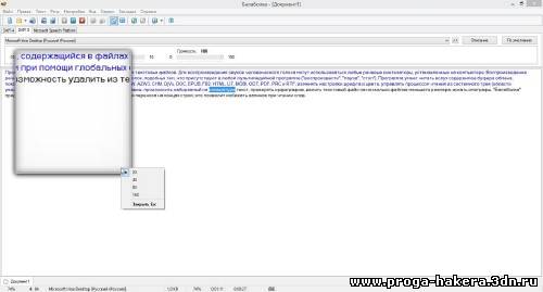 Дополнительная информация: Программа умеет читать вслух содержимое буфера обмена, показывать текст, содержащийся в файлах форматов AZW, CHM, DjVu, DOC, EPUB, FB2, HTML, LIT, MOBI, ODT, PDF, PRC и RTF, изменять настройки шрифта и цвета, управлять процессом чтения из системного трея (области уведомлений) или при помощи глобальных сочетаний клавиш, произносить набираемый на клавиатуре текст, проверять орфографию, делить текстовый файл на несколько файлов меньшего размера, искать омографы. "Балаболка" предоставляет возможность удалить из текста все знаки переноса на концах строк; это позволит избежать запинок при чтении слов.