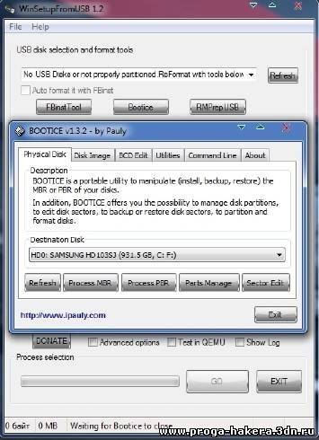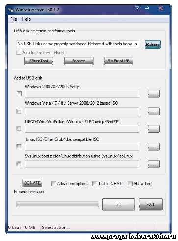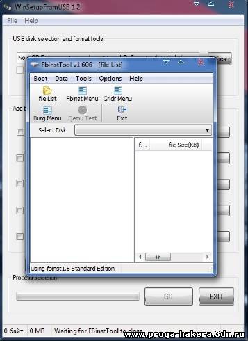 Краткая инструкция: Подключить флэшку и выбрать её в программе. Отметить флаг Auto format it with FBinst для форматирования в FAT32 или NTFS. Выбрать образы или файлы операционных систем для установки на флешку (для Windows нужно предварительно распаковать образ и указать путь на установочные файлы). Нажать кнопку GO