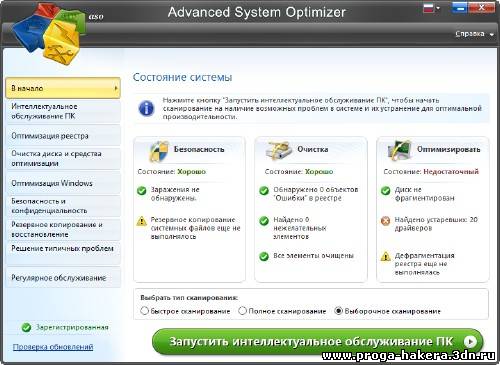 Advanced System Optimizer - пакет утилит для настройки и оптимизации вашей операционной системы - позволяет изменять скрытые параметы ОС, очищать жесткий диск от 'приватной' информации, проводить резервное копирование системных файлов, а также исправлять ошибки в системном реестре и выполнять его дефрагментацию - всего порядка тридцати утилит.