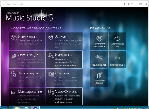 Ashampoo Music Studio 5 - всё-в-одном для создания, редактирования, дизайна и продюсирования Вашей музыки. Включает в себя граббер музыкальных дисков, запись CD, DVD и Blu-ray дисков, модуль для организации музыкальных коллекций, редактор аудиофайлов, модуль записи звука, а также модуль восстановления поврежденных аудиофайлов. Поддерживает работу со многими форматами аудио. Программа необходима всем, кто имеет дело с цифровой музыкой.