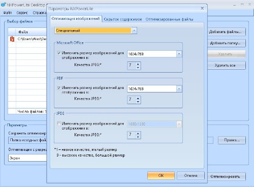 NXPowerLite — быстрая, простая и эффективная программа для оптимизации документов Microsoft Word, таблиц Excel и PowerPoint презентаций с помощью сжатия графики и связанных документов. Всё, что вам нужно сделать — выбрать любой документ в формате Word, Excel или PowerPoint, выбрать уровень сжатия, определив наилучший баланс между размером и качеством и нажать кнопку запуска оптимизации. Можно выбрать сразу несколько файлов, что позволит быстро освободить заметную долю пространства на жёстком диске. Также программа может просмотреть в автоматическом режиме и найти способы оптимизации содержимого документов. Программа полностью настраиваема, поэтому вы можете выбрать баланс между качеством и сжатием. Ваши документы сохраняют формат файла и остаются полностью доступными для редактирования, они могут быть открыты и отредактированы в любой копии Word, Excel и PowerPoint. Интерфейс программы переведен на несколько языков, включая русский язык.
