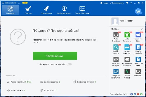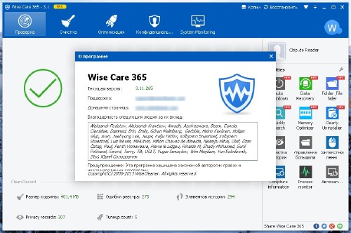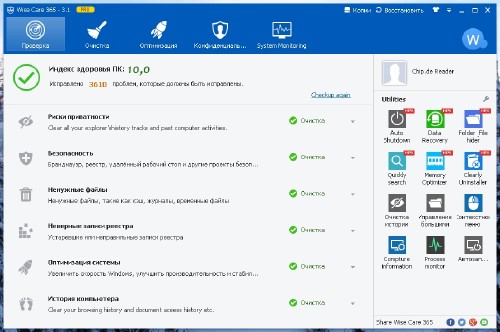 Wise Care 365 – программный пакет, предназначенный для оптимизации, настройки и очистки компьютера.