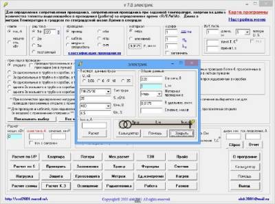 Добавлено: В модуль расчета "ТЭН" добавлен расчет обогрева помещений (кнопка "ТЭН"): Определить мощность для отопления по площади помещения Определить площадь для прогрева помещения по мощности Расчет мощности электрического конвектора Расчет мощности инфрокрасных обогревателей В модуль "Разное" добавлен расчет характеристик двигателей (режимы работ ПВ, ДТ) (кнопка "Разное")